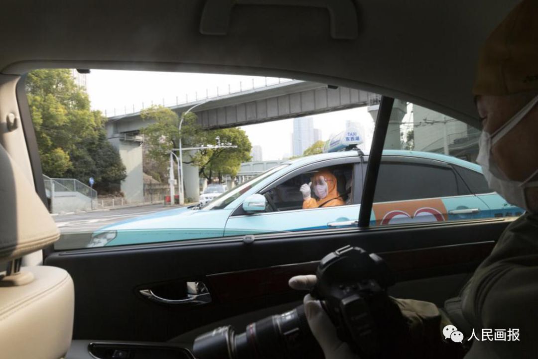 用防护服、口罩进行全副武装的出租车司机,向记者们伸出大拇指“点赞”。摄影 段崴/人民画报