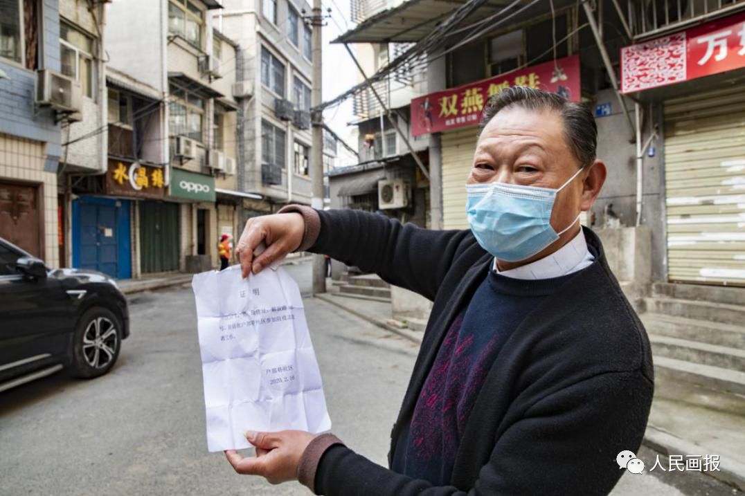王应来先生向记者展示户部巷社区给他写的防疫志愿者证明。摄影 陈建/人民画报