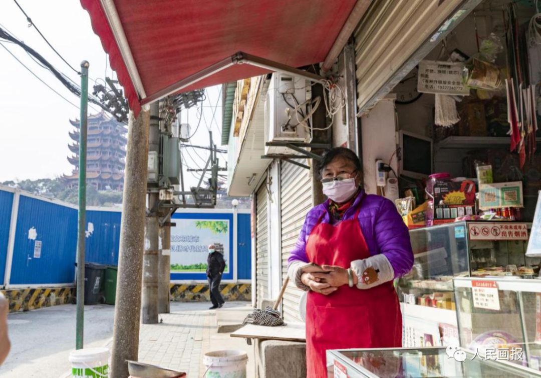 陈女士,独自经营一家小商店,每天早上九点到晚上八点营业。由于现在没办法进货,主要售卖库存商品。小区人不多所以出货量不大,每天卖出百元左右商品。陈女士的女儿一家在武汉其他小区封闭隔离,每天他们都通过电话互报平安。摄影 陈建/人民画报