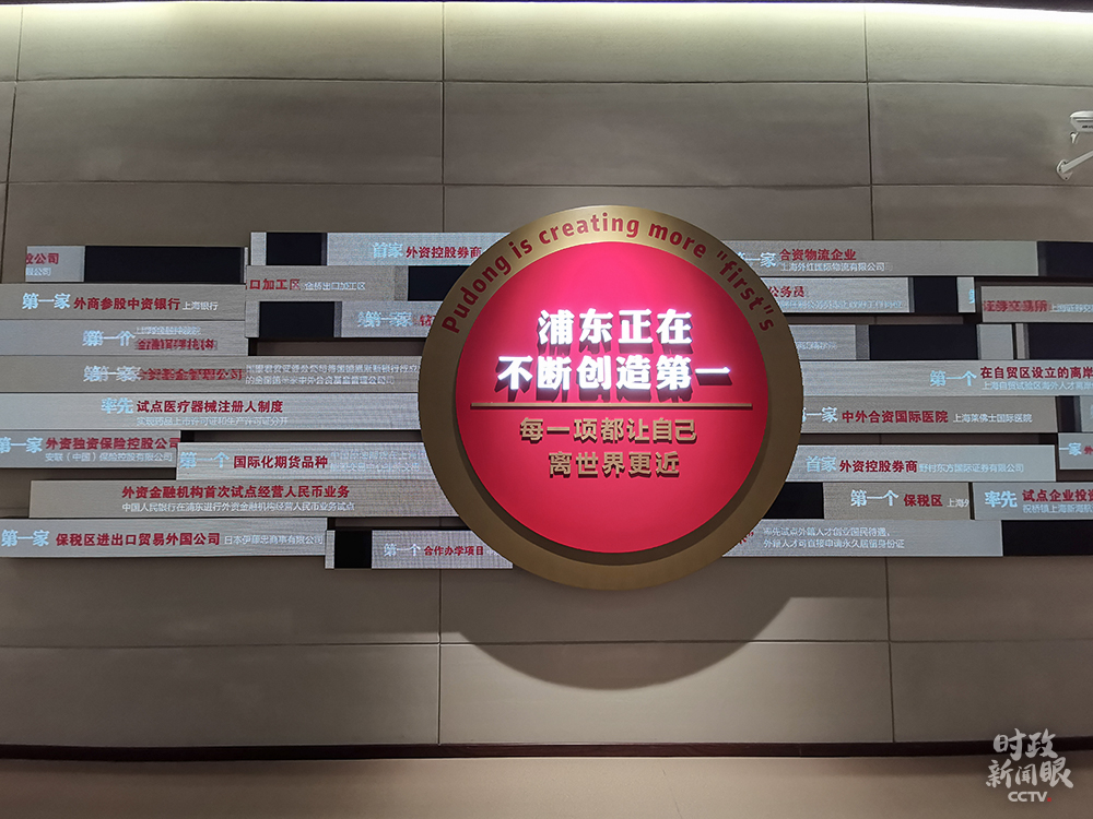 △“浦东开发开放30周年主题展”列出了浦东新区建设的多项“第一”。(总台央视记者王冰拍摄)