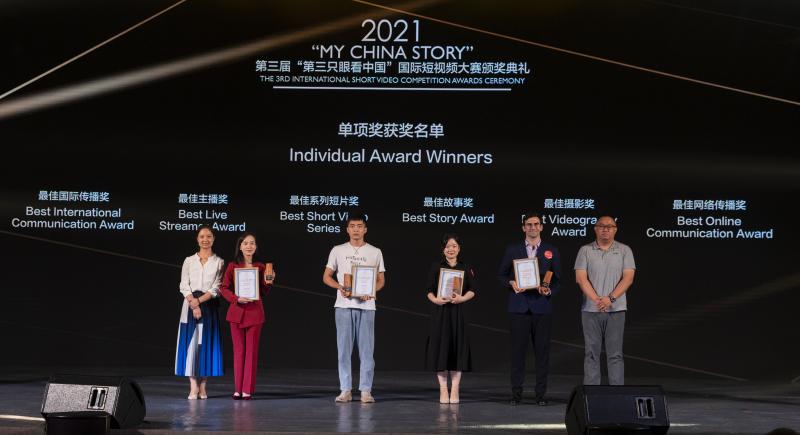 ▲五洲传播出版社对外传播中心主任李缅,新加坡海滩别墅影业有限公司(BHP)中国区总经理冯博为《身在中国 纪录你我》单元获奖代表颁奖。