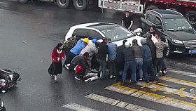 危急时刻,20多人合力抬车救援
