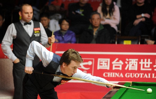 2012年11月8日,斯诺克——世界巡回赛郑州公开赛:宾汉姆晋级四强 11月8日,达赫迪(前)在比赛中击球。 当日,在郑州举办的2012世界斯诺克巡回赛郑州公开赛8强的比赛中,爱尔兰选手达赫迪以1比4不敌英格兰选手宾汉姆,无缘四强。 新华社记者李博摄