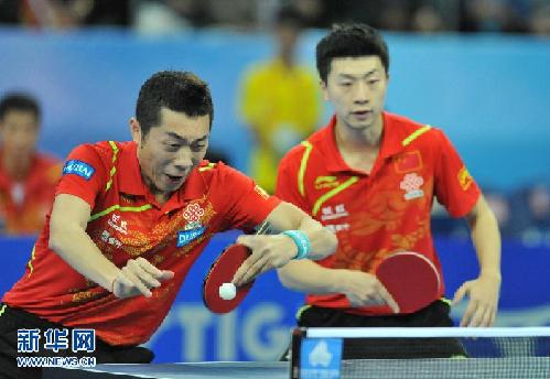 3月31日,中国选手马龙/许昕(左)在比赛中回球。最终,马龙/许昕在双打比赛中以3比0战胜中华台北选手江宏杰/陈建安。当日,在广州进行的2013世界杯乒乓球团体赛男子决赛中,中国队以3比1战胜中华台北队,夺得冠军。 新华社记者卢汉欣摄