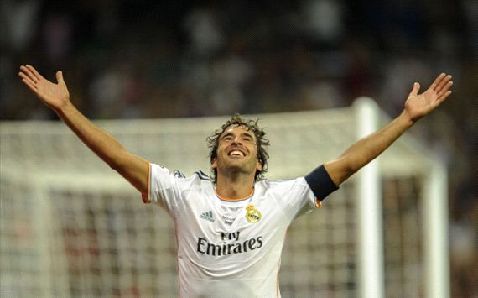 此次前皇马队长劳尔随阿尔萨德造访马德里引起了不小的轰动,劳尔上半场将代表皇马出战45分钟,下半场则会代表阿尔萨德出战。第23分钟,C罗头球摆渡,迪马利亚第一时间凌空直传,劳尔禁区左肋12码处半凌空抽射破门,皇马1-0。
