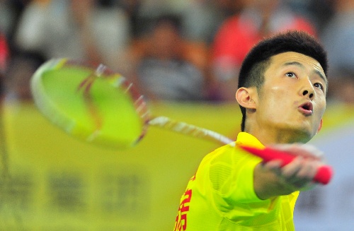9月28日,厦门特房队选手谌龙在男单比赛中回球,他最终以2比0战胜广州粤羽队选手王睁茗。 当日, 2013-2014赛季中国羽毛球俱乐部超级联赛首轮赛事在厦门打响。厦门特房队以总比分5比0战胜广州粤羽队。 新华社记者魏培全摄