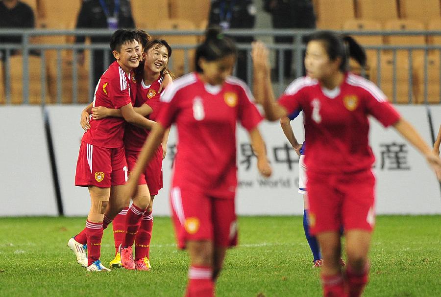 10月11日,中国队球员进球后庆祝。 当日,在天津举行的第六届东亚运动会女子足球第3轮比赛中,中国队以2比2战平中华台北队。 新华社记者郭程摄