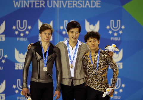 12月13日,在意大利特伦蒂诺进行的第26届世界大学生冬季运动会花样滑冰男子单人滑比赛中,来自北京体育大学的中国选手宋楠以220.70分的成绩为中国代表团摘得首枚金牌。新华社记者白雪飞摄