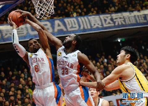 12月18日,四川爱家168队球员怀特(中)和队友菲巴在比赛中拼抢。当日,在四川成都进行的2013-2014赛季中国男子篮球职业联赛(CBA)第14轮比赛中,四川爱家168队以113比112胜浙江广厦队。新华社记者李桥桥摄