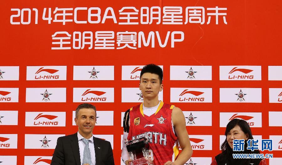 1月19日,获得全明星赛最有价值球员(MVP)的北方明星队球员孙悦(中)在颁奖仪式上。当日,在北京万事达中心举行的2014年CBA全明星赛中,北方明星队以118比102战胜南方明星队。新华社记者曹灿摄