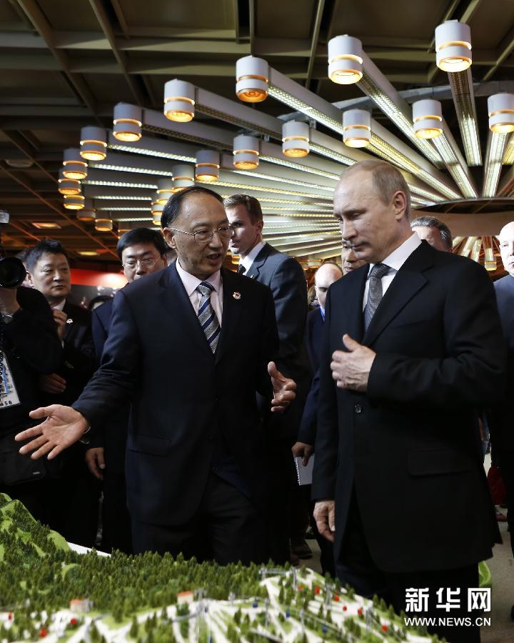 2月10日,刘鹏(前左)为普京介绍2022年冬奥会申奥城市张家口的雪上项目场馆分布图。 新华社记者丁旭摄