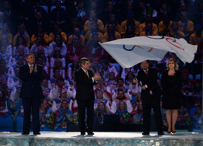 五环旗交接仪式上,索契市市长将五环旗交给国际奥委会(IOC)主席巴赫,巴赫将五环旗转交到下一届冬奥会东道主韩国的平昌郡郡守(相当于县长)李锡来手中。随后韩国国歌《爱国歌》奏响,两位来自韩国的小朋友身穿韩服并领唱《爱国歌》。平昌进行8分钟文化艺术表演,向世界提前展现了下届冬奥会主办地的风采。