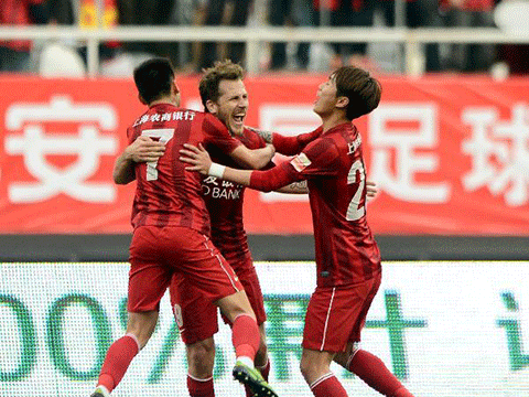 3月16日,上海上港队球员海森(中)进球后与队友庆祝。 当日,在2014年中超联赛第二轮比赛中,上海上港队主场以5比1战胜上海申鑫队。 新华社发(曹子琛摄)