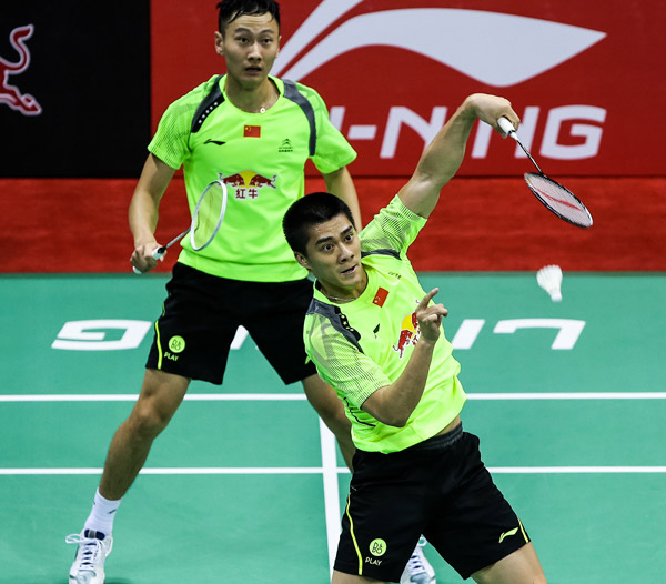 傅海峰在汤姆斯杯第一天比赛中与张楠搭档2-0战胜法国对手