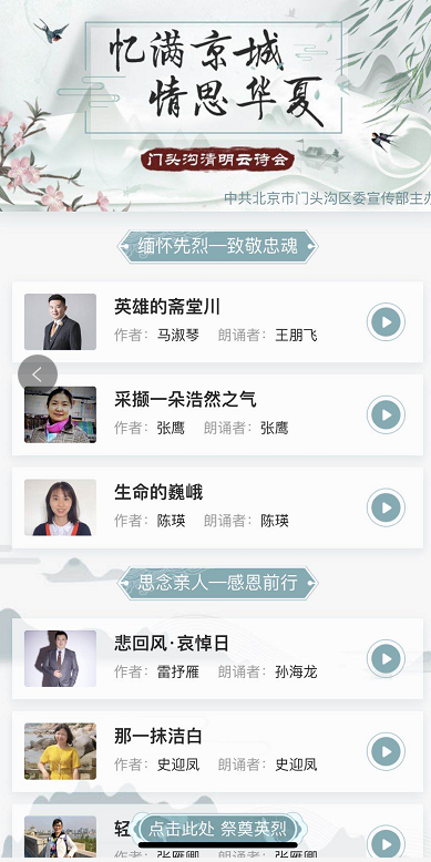 云诗会分为“缅怀先烈——致敬忠魂”、“思念亲人——感恩前行”、“春暖花开艳阳天”三个部分,共选取并朗诵诗歌作品11篇,有来自中国当代著名诗人李小雨的《小雨》、雷抒雁的《悲回风·哀悼日》,也有来自门头沟区作协会员的作品,还有来自门头沟区各个行业诗歌爱好者的原创诗歌,题材丰富,内容真挚,感人至深。