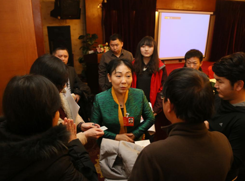 会议结束后,媒体记者围着全国人大代表向红琼进行采访 张丽 摄