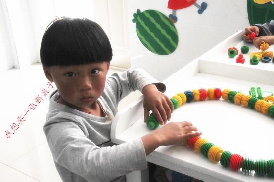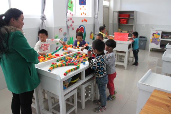 学前班的小朋友没有标准的幼儿课桌,只能用实验桌站着玩