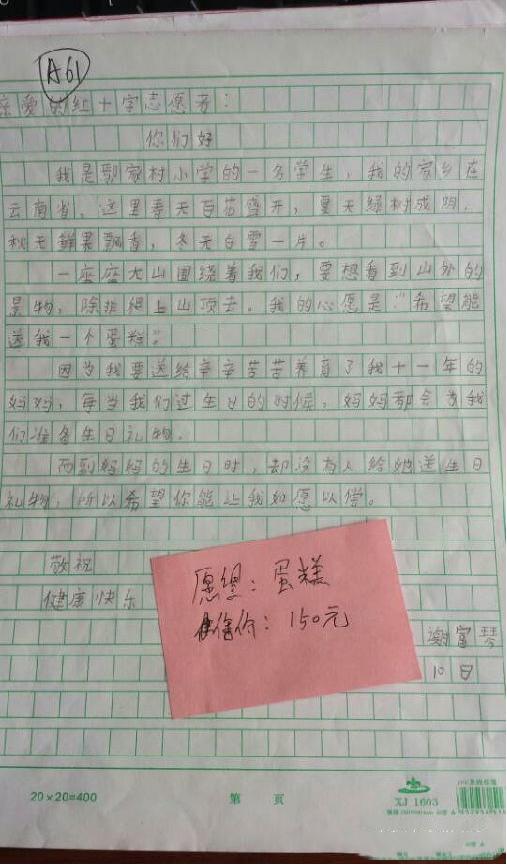 听到这个心愿,我们的志愿者很感动,志愿者很努力地跑了好多家花店,帮她买到了最美的康乃馨。我以为故事到这里就结束了,一个小女孩,一个才读小学三年级的小女孩,在听到自己有一次实现心愿的机会之后,没有去想着城市里小女孩随便就可以人手一个的芭比娃娃,没有去想同龄小女孩穿的漂亮的小裙子,她第一时间想到的是为了生活一直在外面打工挣钱的母亲,是那个一直为了生活而奔波的母亲。也许她和母亲的联系只有一天十多分钟的电话,但母子连心。只是一个小小的心愿便牵动了她那纤弱敏感的神经。