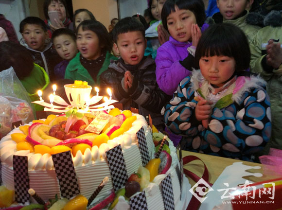 演出结束后,永善县团委党员干部、退休干部、消防大队官兵和爱心人士一起热热闹闹地给52名贫困儿童一起过生日,切分了生日蛋糕,并祝福孩子们生日快乐,吃到甜甜的蛋糕,孩子们心里一个个乐滋滋的,感受到“家”的温暖。