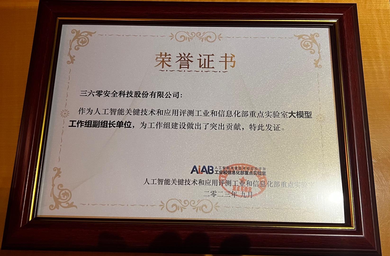 9月17日,2023南京人工智能产业发展大会上,三六零集团被授予人工智能重点实验室大模型工作组副组长单位,参与中国信通院大模型标准体系2的建设,助力中国大模型产业发展及落地。