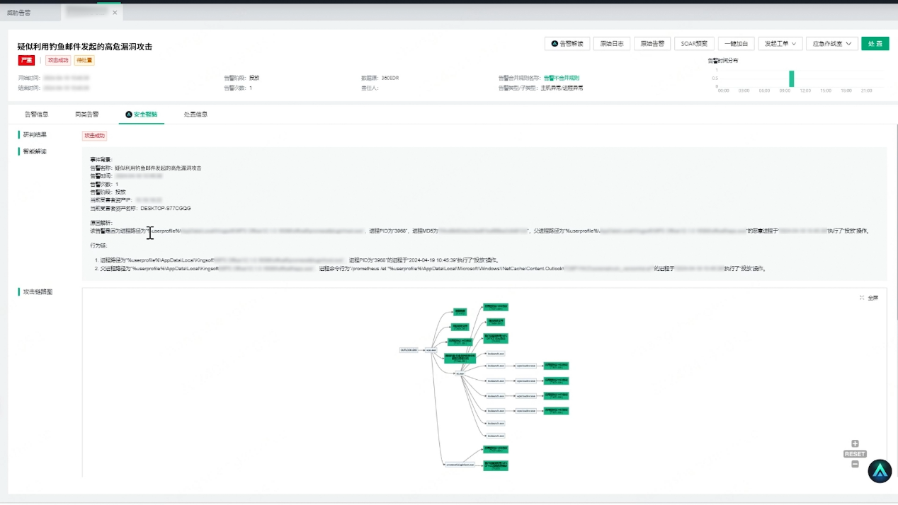 安全大模型3.0加持下,360本地安全大脑在针对每一次告警的智能化运营中实现自动溯源和结果定性,通过解读告警给运营人员呈现该攻击的背景情况、可能原因、发生过程、影响哪些资产、攻击者画像、潜在原因以及攻击过程链路等自动研判后的结论,让运营人员仅需要查看经过大模型分析的告警结论便可快速进行安全决策,降低安全运营门槛,解放运营人员精力。