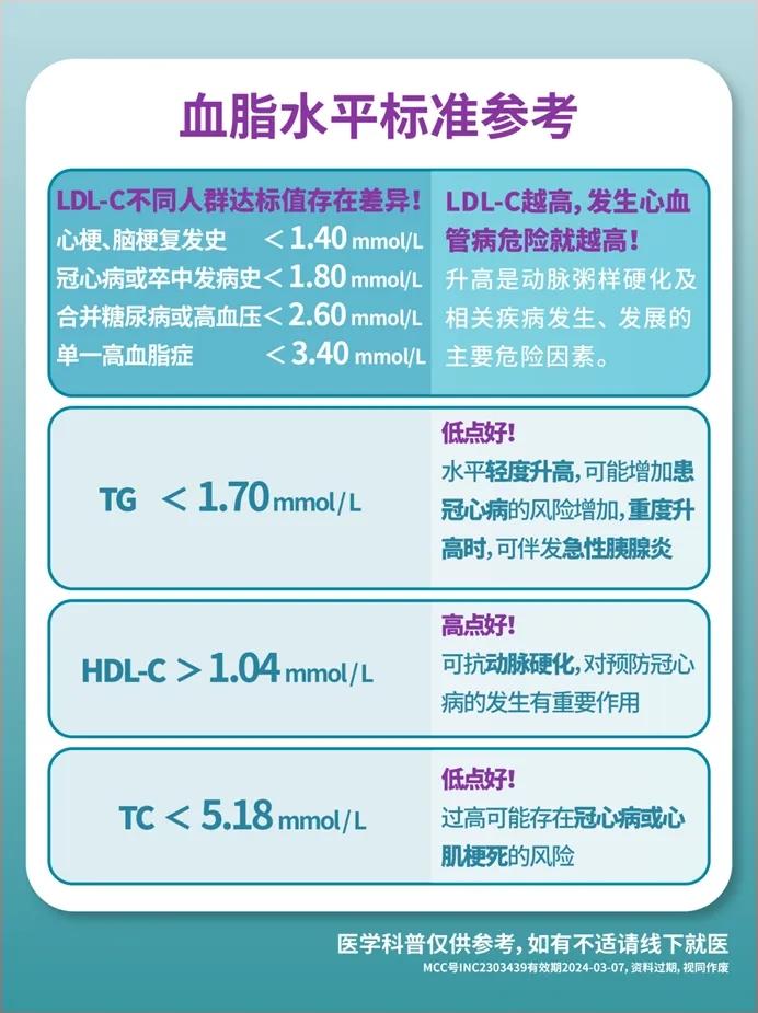 对于血脂水平超过一定范围,或生活调控效果不佳的人群,需在医生建议下,坚持生活调控,并加用调脂药物!将血脂长期控制在“安全线”内!