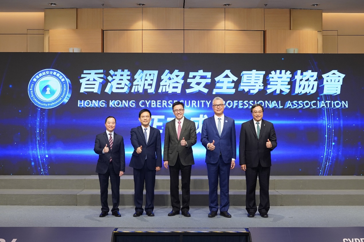 图:中央政府驻港联络办秘书长王松苗(左二)、创科局局长孙东(中)、数字政策专员黄志光(左一)、香港互联网注册管理有限公司主席陈细明(右一)和香港网络安全专业协会会长郑松岩(右二)
