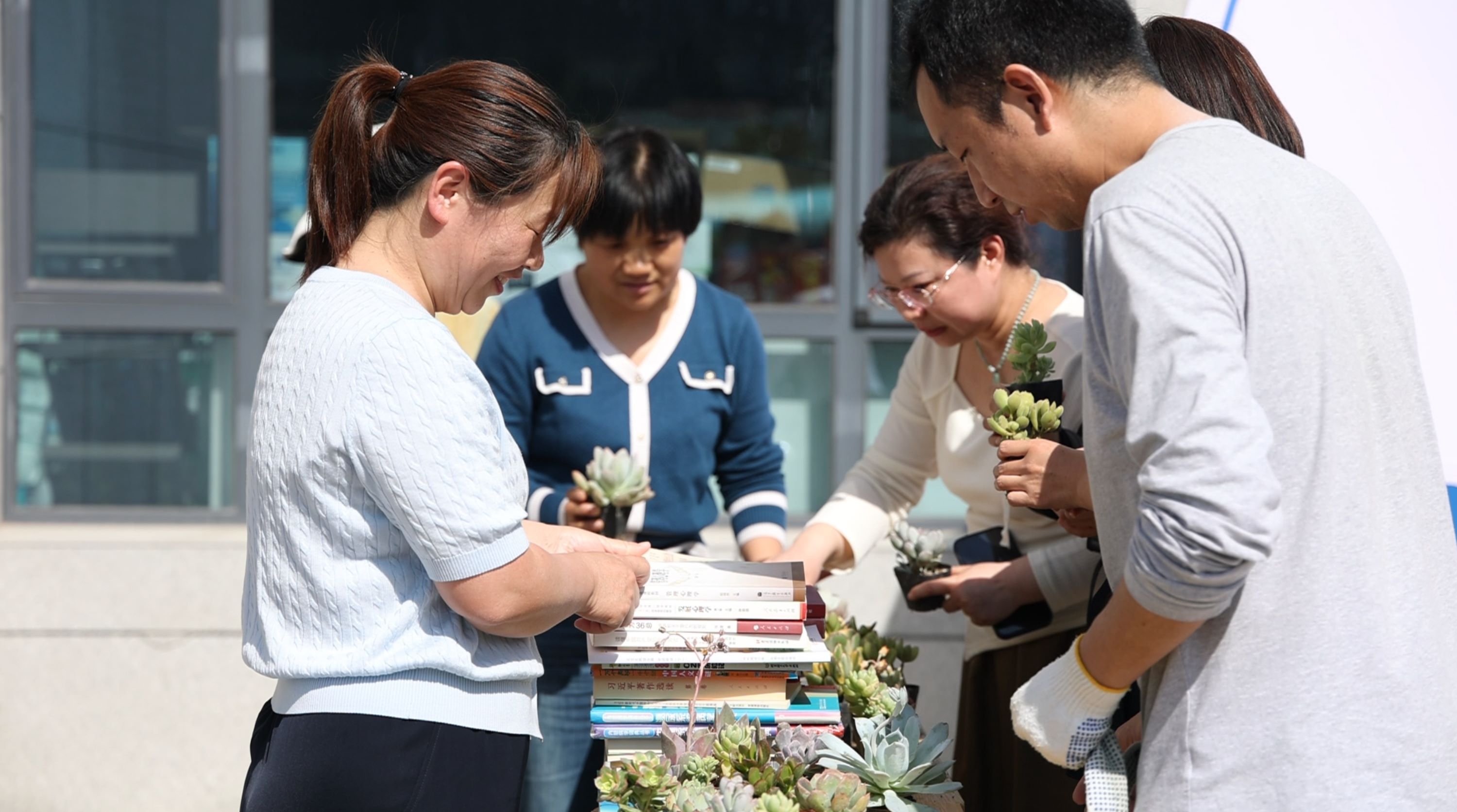 在“书籍换绿植”活动环节,教职工生纷纷带着闲置书籍前来兑换绿植,上演了书香与绿意交融的暖心画面。现场回收的书籍种类丰富,涵盖医学人文、文学名著、科普读物等多个类别,这些承载着温度的书籍将放置在图书馆及读书吧内,实现知识共享,构建起捐赠—传播—再生的闭环生态。
