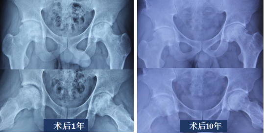 术后随访可见坏死病灶片状硬化,修复良好,外侧壁增厚,股骨头形态保持良好