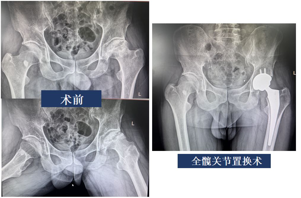 术前X片可见左髋股骨头塌陷明显,关节间隙狭窄,呈骨关节炎表现,保髋治疗预后不佳,予行全髋关节置换术