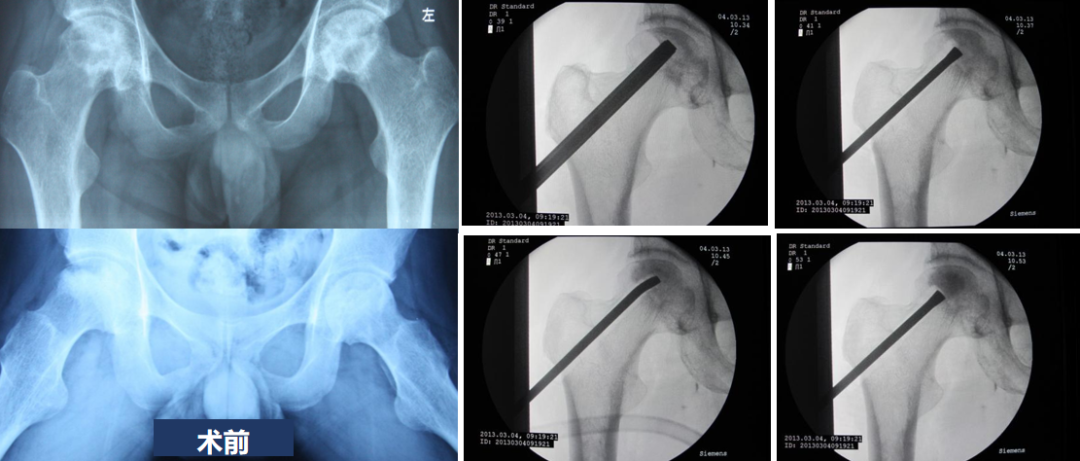术前X片可见双侧股骨头均为JIC C1型,外侧壁部分保留,坏死病灶见片状透亮影,予行髓芯减压植骨术