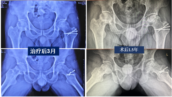 术后随访可见左侧股骨头坏死病灶修复良好,股骨头虽有轻度塌陷,但整体形态保持相对稳定