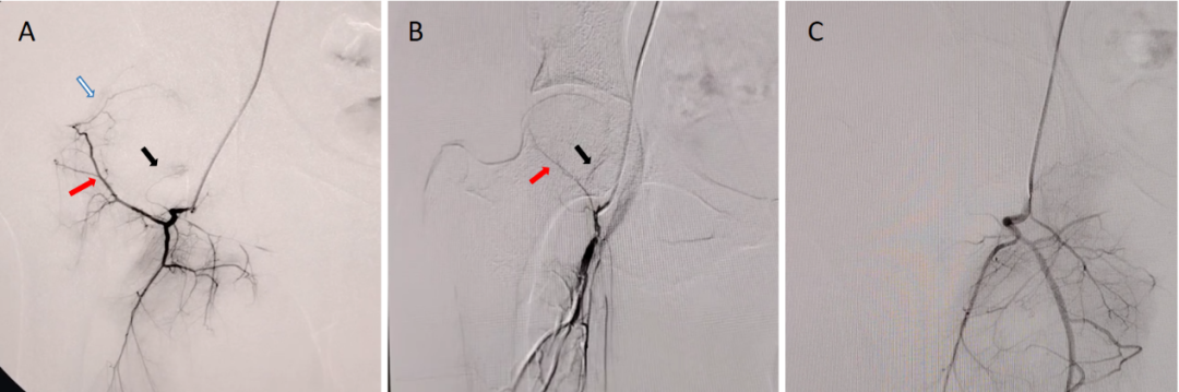 图A可见旋股内动脉(红色箭头)、上支持带动脉(白色箭头)与下支持带动脉(黑色箭头)均显影,表明股骨头血运状态良好;图B可见旋股内动脉显影较淡薄(红色箭头),上支持带动脉未显影,仅下支持带动脉显影(黑色粗箭头),表明血运状态一般;图C.旋股内动脉及上、下支持带动脉均未显影,表明股骨头血运状态较差。