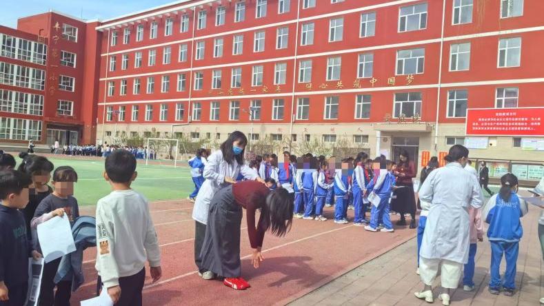 医护团队到达学校与工作人员对接后,老师同学们积极配合,同学们井然有序地排好队,登记组、初筛组、精筛组分工合作,筛查工作有条不紊地进行。 医务人员耐心、细致地为每一位青少年进行脊柱健康检查。通过目测法、前屈试验、脊柱侧弯测量,仪器检测四中种方法进行脊柱侧弯体态筛查,询问日常生活和学习姿势,观察站立、弯腰体态,并在筛查登记表中做好数据记录。学生中很多是高低肩,存在驼背等姿势不良问题,还有一部分疑似脊柱侧弯,医护团队针对存在问题给予了专业的指导,包括调整坐姿、站姿,加强体育锻炼,避免弯腰驼背,翘二郎腿、脊柱过度负重等。