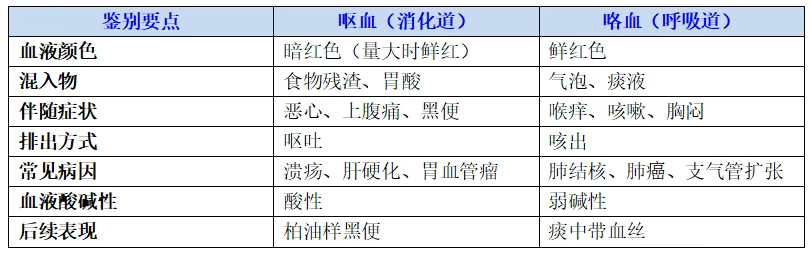 因为呕血多为消化道出血,而咯血多为呼吸道出血,这两种病种救治方式不尽相同。表述病情时应记住“看、问、查”三个字,即“看颜色、问来源、查伴随”,具体可以通过下表来区分“呕血”与“咯血”的关键区别: