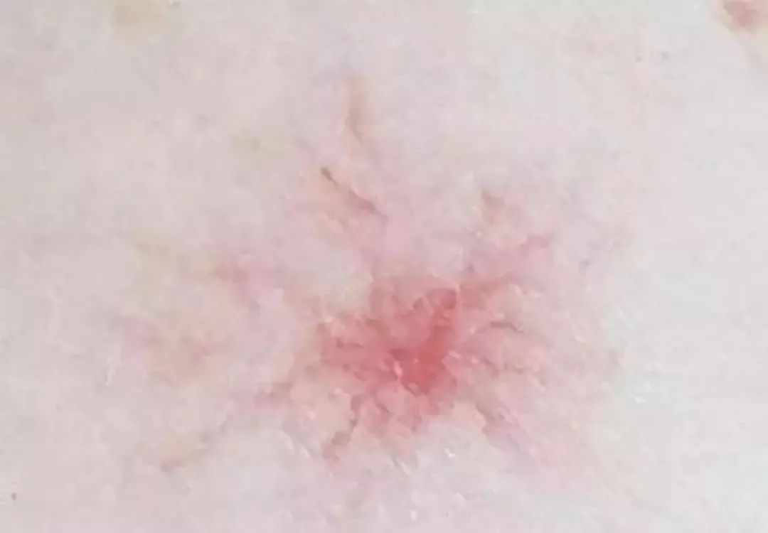 但有一种特殊的“红痣”需要特别警惕,那就是“蜘蛛痣”。当内脏发生疾病时,皮肤往往是疾病外化的一个重要途径。蜘蛛痣是一种常见的皮肤病,是由于血液中雌激素浓度增高,引起了动脉毛细血管扩张,细小动脉向外延伸出许多分支,看起来像一只粉红蜘蛛趴在皮肤上,由此得名。