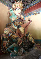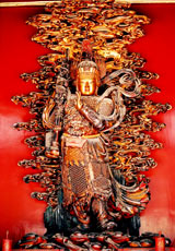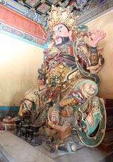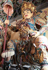 东方持国天王,手持琵琶;南方增长天王,手持宝剑;西方广目天王,手持水蛇;北方多闻天王,手持宝幢。殿后供奉韦驮护法像