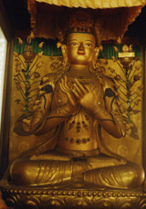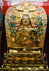 此殿顶部设五座天窗,窗上置五座鎏金宝顶,体现了藏传佛教寺院的建筑风格。殿内正中供藏传佛教格鲁派创始人宗喀巴大师像。